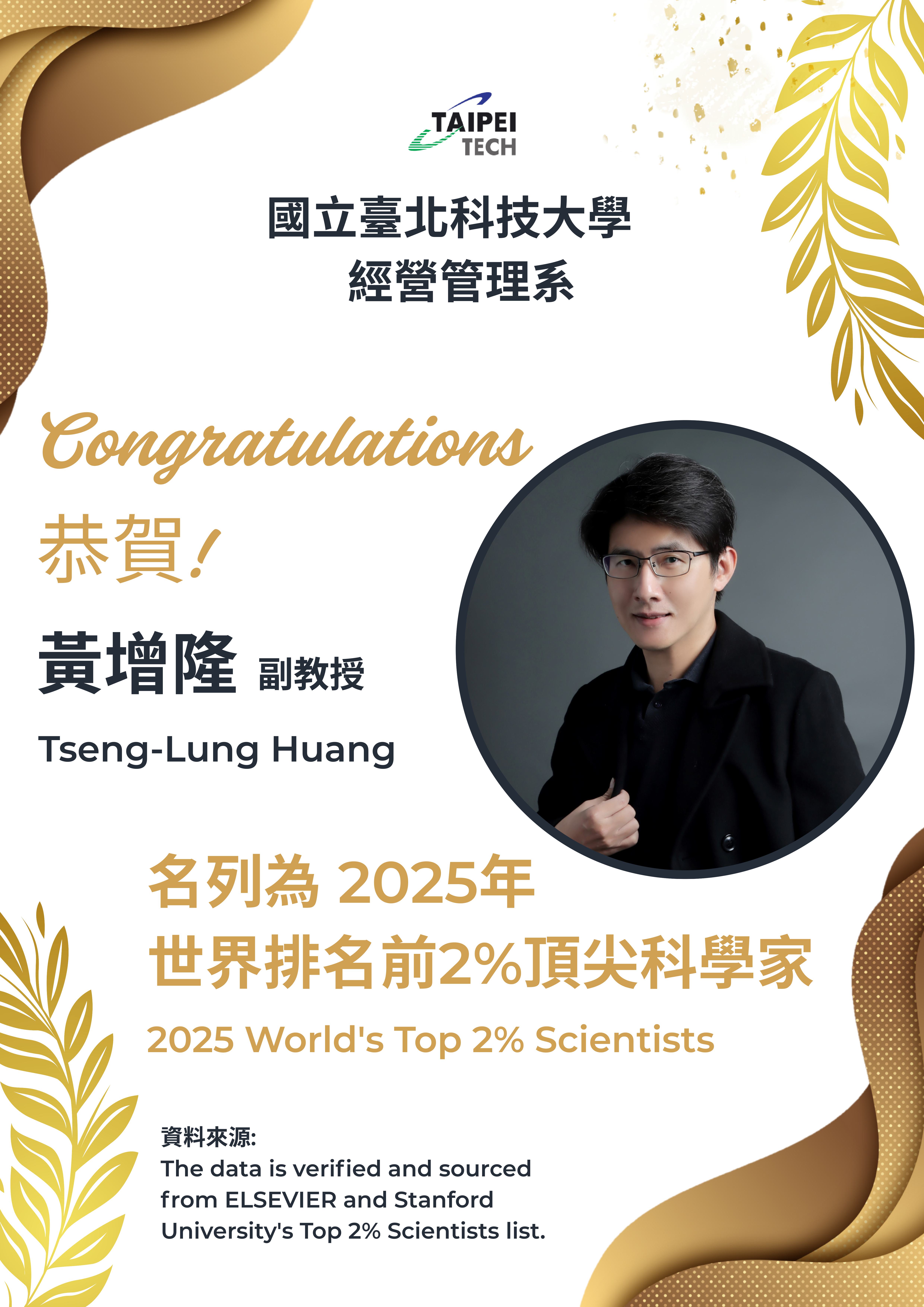 【系所榮譽】賀!恭喜 黃增隆副教授 名列為2025年世界排名前2%頂尖科學家